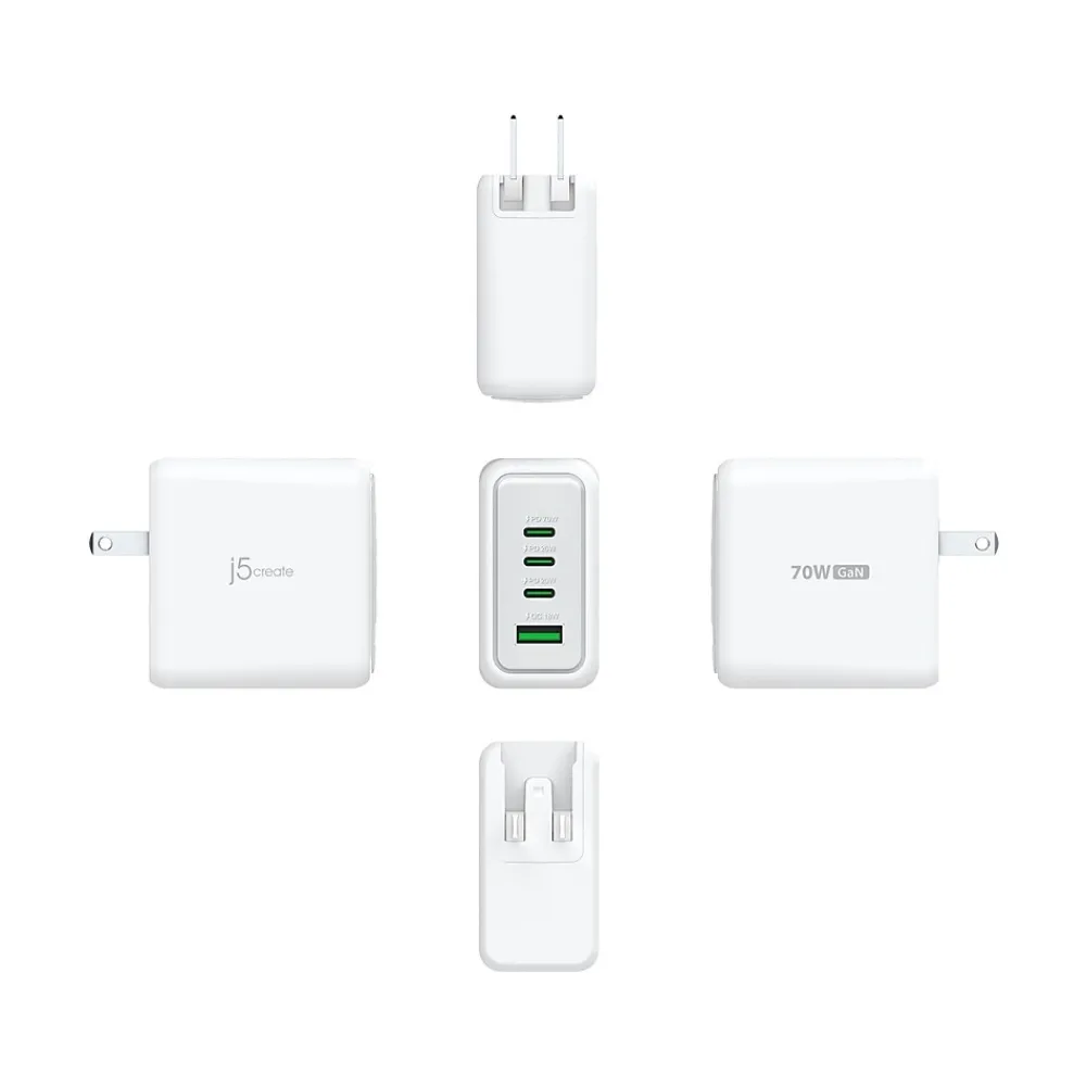 The j5create 70W GaN USB Type-C four-port charger can simultaneously charge four devices. The charger uses GaN technology, which enables it to deliver a significant amount of power in a small package. All the USB Type-C ports support Power Delivery 3.0/2.0 technology, the USB Type-A port supports QC 18W fast charge. When using just one of the ports, the first port supports up to 70W, enabling MacBooks, laptops, tablets, handheld game consoles, and other mobile devices to charge at the fastest rates possible. The second and third port support up to 20W each, which is enough for charging a second tablet or phone. The product keeps 45W on the first port while other port(s) is/are being in use, so you can seamlessly charge your laptop and other devices at the same time. With its small and light design, the charger can attach to the wall more firmly, reducing the chance of falling off. Moreover, the charger includes protection against surges, overcharging, overcurrent, and overheating.