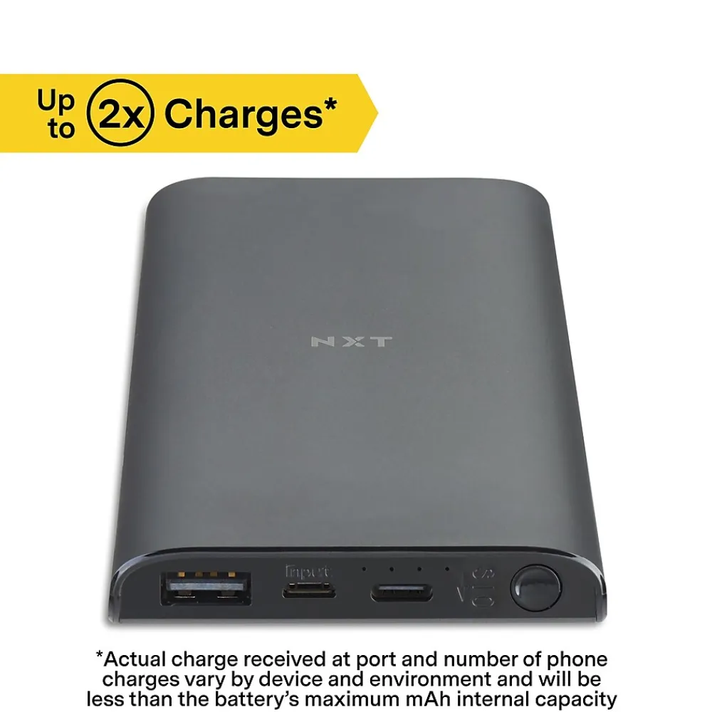 Keep your phone or tablet powered with this power bank bundle. The LED indicator light lets you know when the power bank is full, and the included cable enables seamless recharges. This NXT Technologies™ 10000mAh portable power bank bundle features a USB Type-A and USB Type-C port for compatibility with most cables and devices.