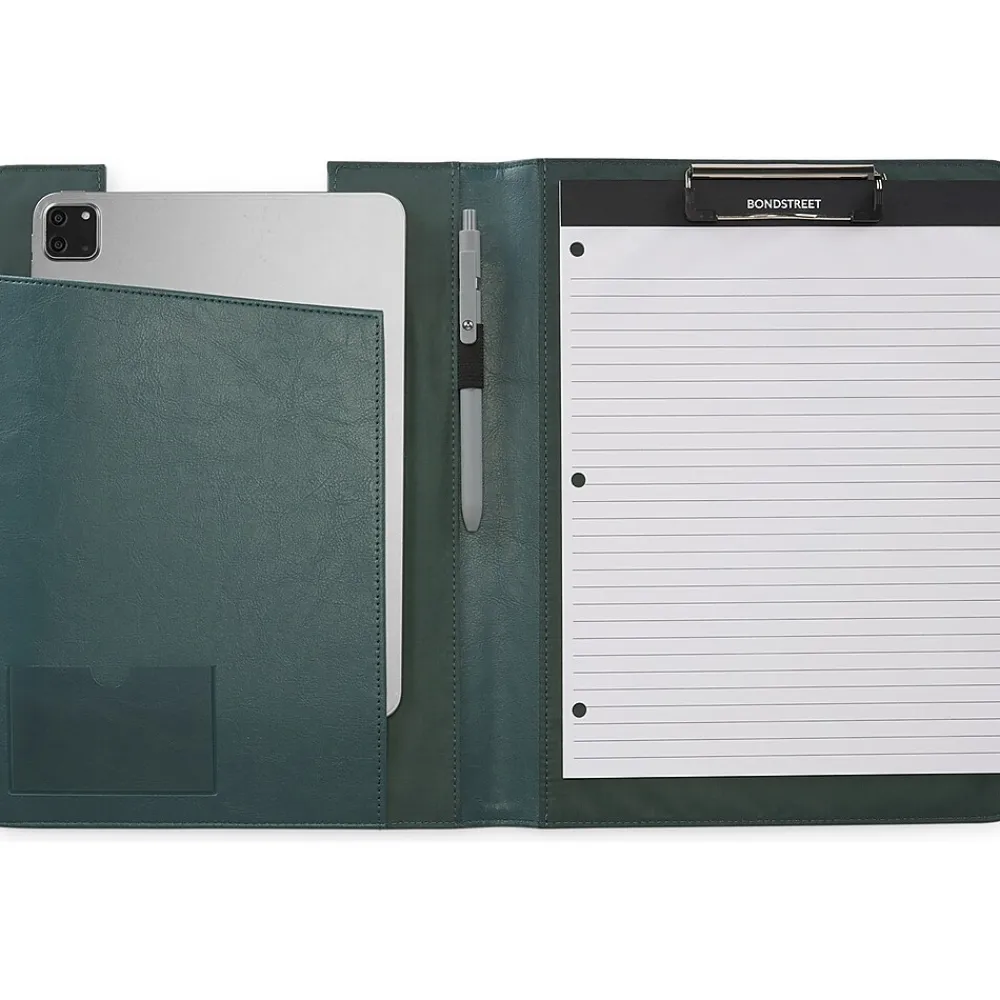 Attractive and convenient, this Bond Street vegan leather padfolio features a rigid back, an easily removable writing pad, and a place to store paper documents.