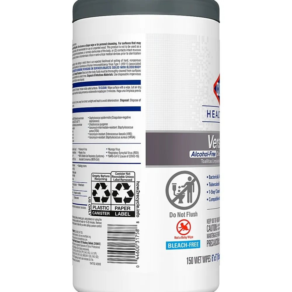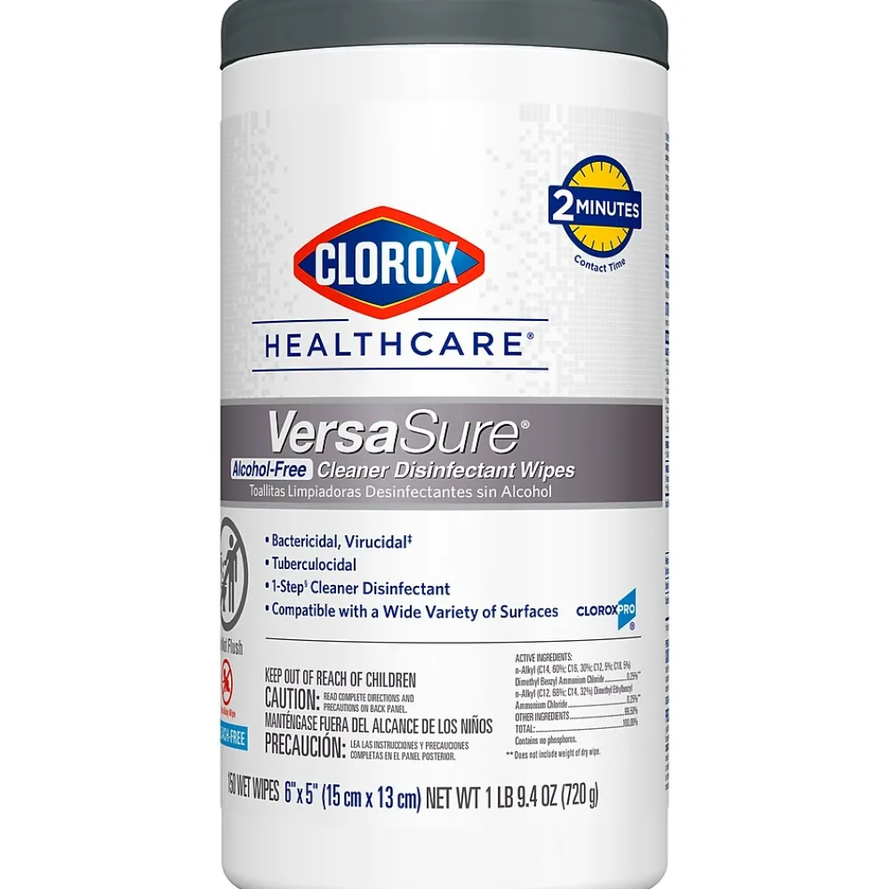 Clorox Healthcare VersaSure Cleaner Disinfectant Wipes kill over 40 pathogens* quickly on a broad range of surfaces. These strong and durable clothlike wipes are your alcohol free solution to cleaning and disinfecting. VersaSure wipes are EPA registered to kill pathogens on hard surfaces in as fast as 30 seconds for most bacteria and viruses, including mumps, measles, MRSA and tuberculosis. These one step disinfecting wipes meet EPA efficacy testing requirements for hospital disinfection, making them great for daily use in your healthcare facility. Designed for patient and staff comfort, the alcohol free quat formula is made with no harsh chemical odors, fumes or added fragrances. The non woven wipe does not leave lint on surfaces, and the larger wipe covers more surface area with less effort. Intended for use in healthcare settings.