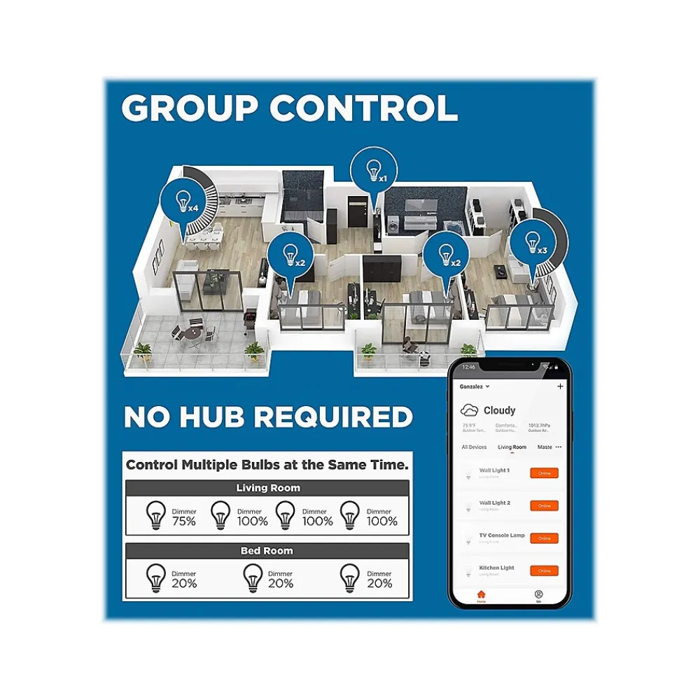 - A19 bulb with color temperatures from 2700K to 5000K; dimmable with app