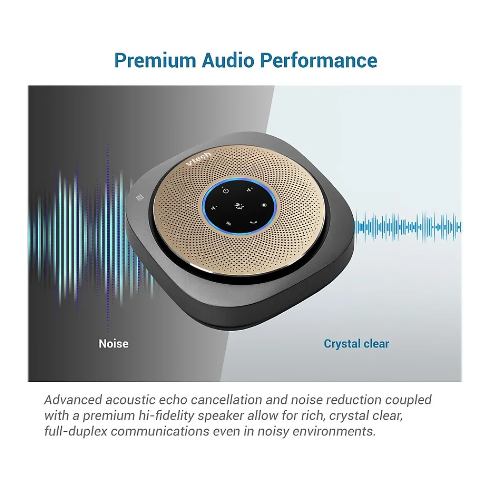 The VTech VCS601-2 Bluetooth conference speakerphone offers quick and easy connection to your smartphone, tablet, or laptop to meet your communication needs. The speakerphone includes six microphones to provide true 360-degree coverage to ensure users are heard from every angle and distance, while the echo cancellation helps eliminate background noise and ensure crisp, clear communication. The large 3W speaker provides a premium sound performance for listening to music while you work or take that important audio- or videoconference call. The built-in 5200mAh battery supports up to 24 hours of talk time and doubles as a USB power bank, so you can keep your smart devices charged while on the go.
