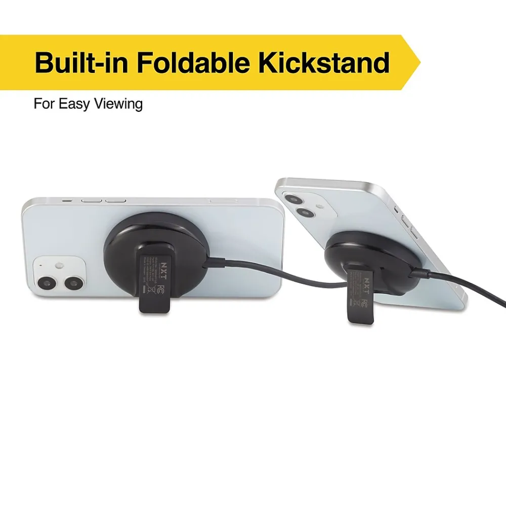 Get rapid, cable-free power with this wireless magnetic charging pad bundle. The included 20W AC adapter delivers charging power up to 10W, while the strong magnet on the charging pad ensures steady charging. This NXT Technologies™ magnetic wireless charging pad is compatible MagSafe official cases and features a built-in kickstand for convenient hands-free use while your phone charges.